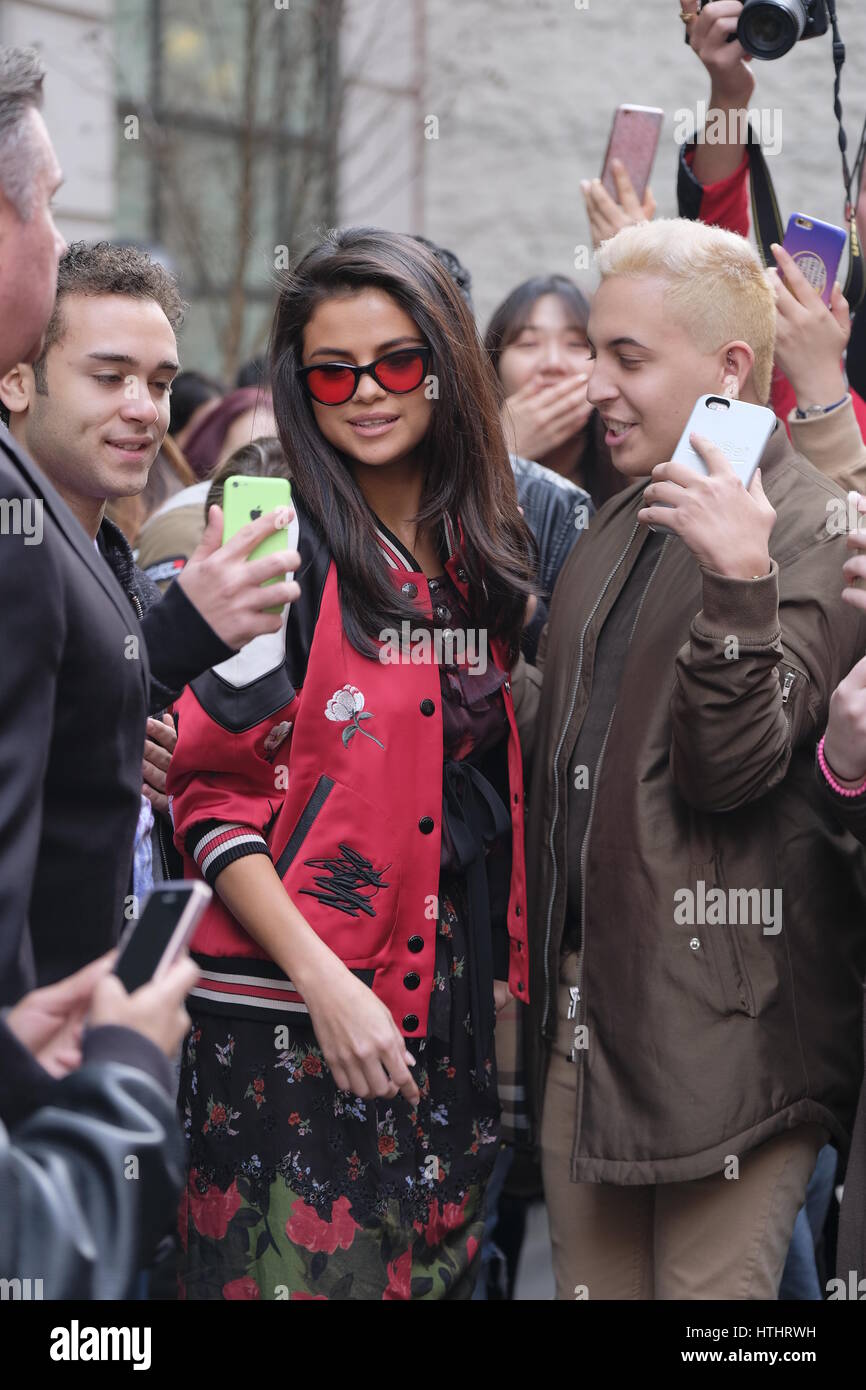 Selena Gomez Greets Fans As She Leaves Her Hotel In New York Stock